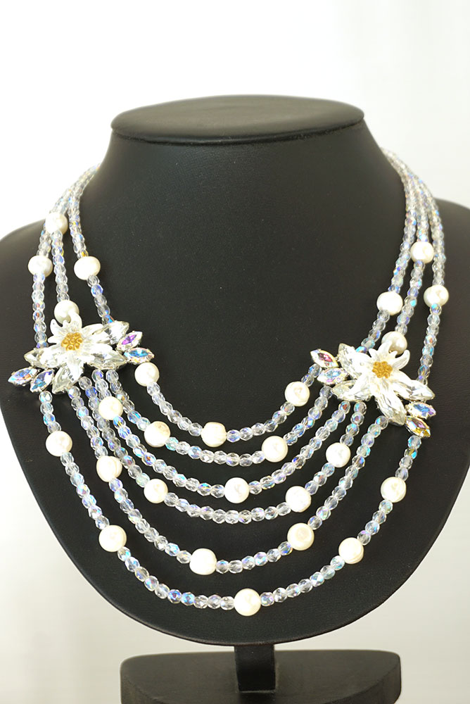 Die aufwendige Trachtenkette mit Perlen hat eine Länge von ca. 46 cm. Die olivefarbenen Kristallperlen scheinen je nach Lichteinfall in verschiedenen Farben.Nickelfrei